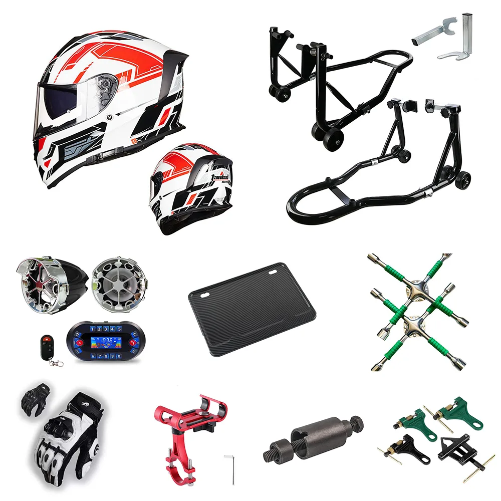 Dette er din motorcykels skelet og suspension. Det starter med rammen og fenderen. Det forreste gaffel- og ophængssystem (inklusive støddæmperkomponenter) håndterer stød. Din forbindelse til vejen er gennem hjulet, huben, hjulkanten og dækket. Det funktionelle og beskyttende tilbehør, f.eks. Anti-tyveri-lås, kofanger/crashbeskyttelse, bagspejl, opbevaringsboks, vagtramme (motorvagter/crashbjælker), kickstand og forruden, endda dekorativt tilbehør, der monterer til chassisets pasform.